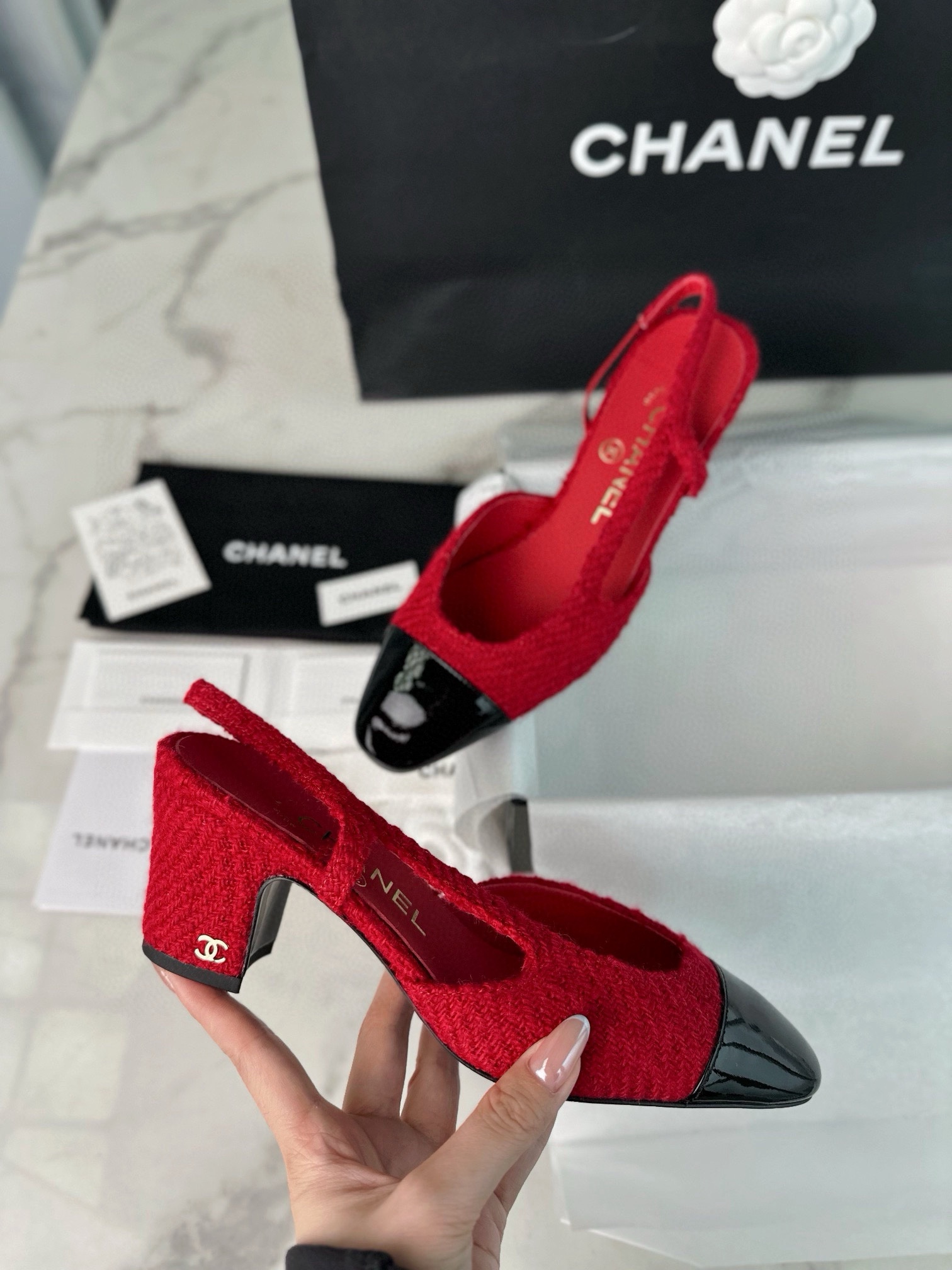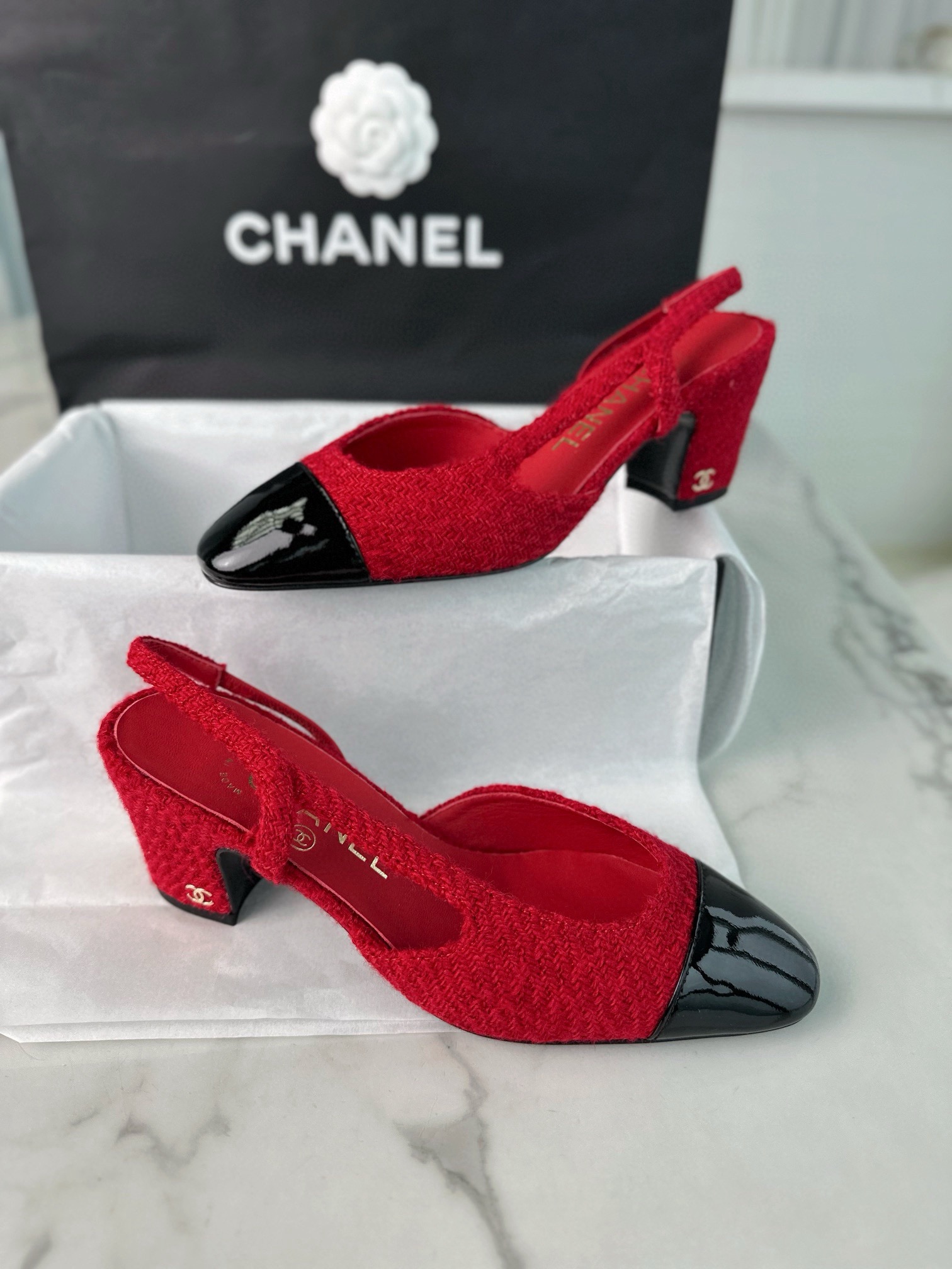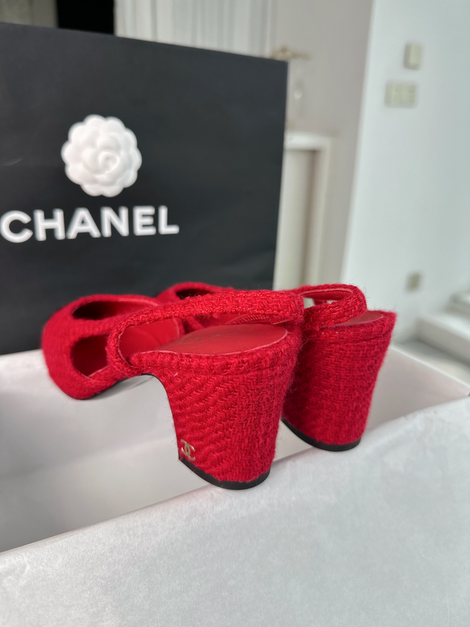 샤넬 레드 트위드 슬링백 하이힐