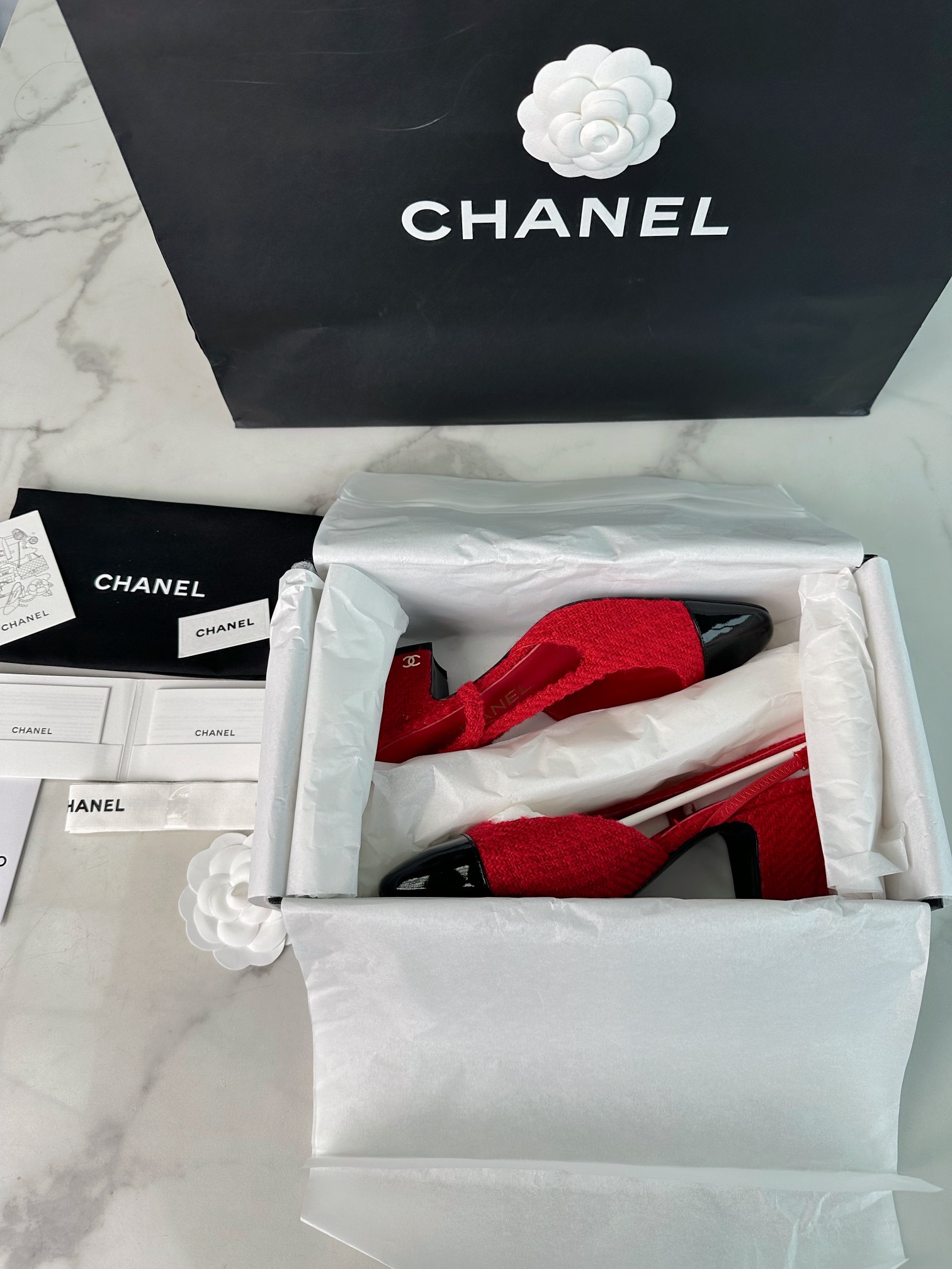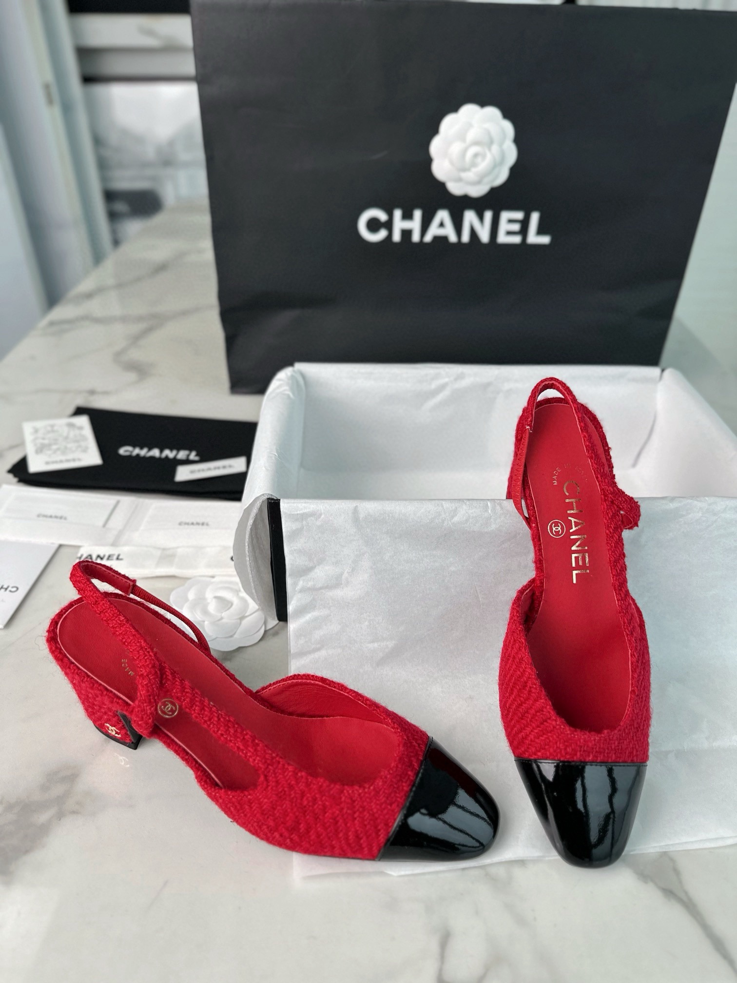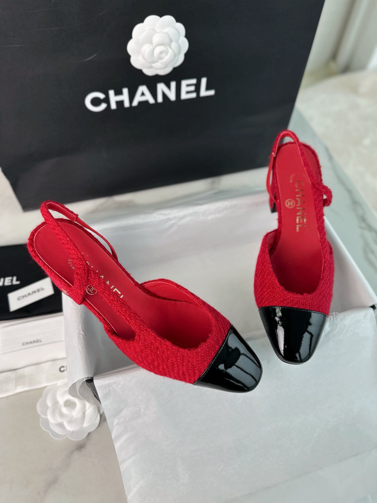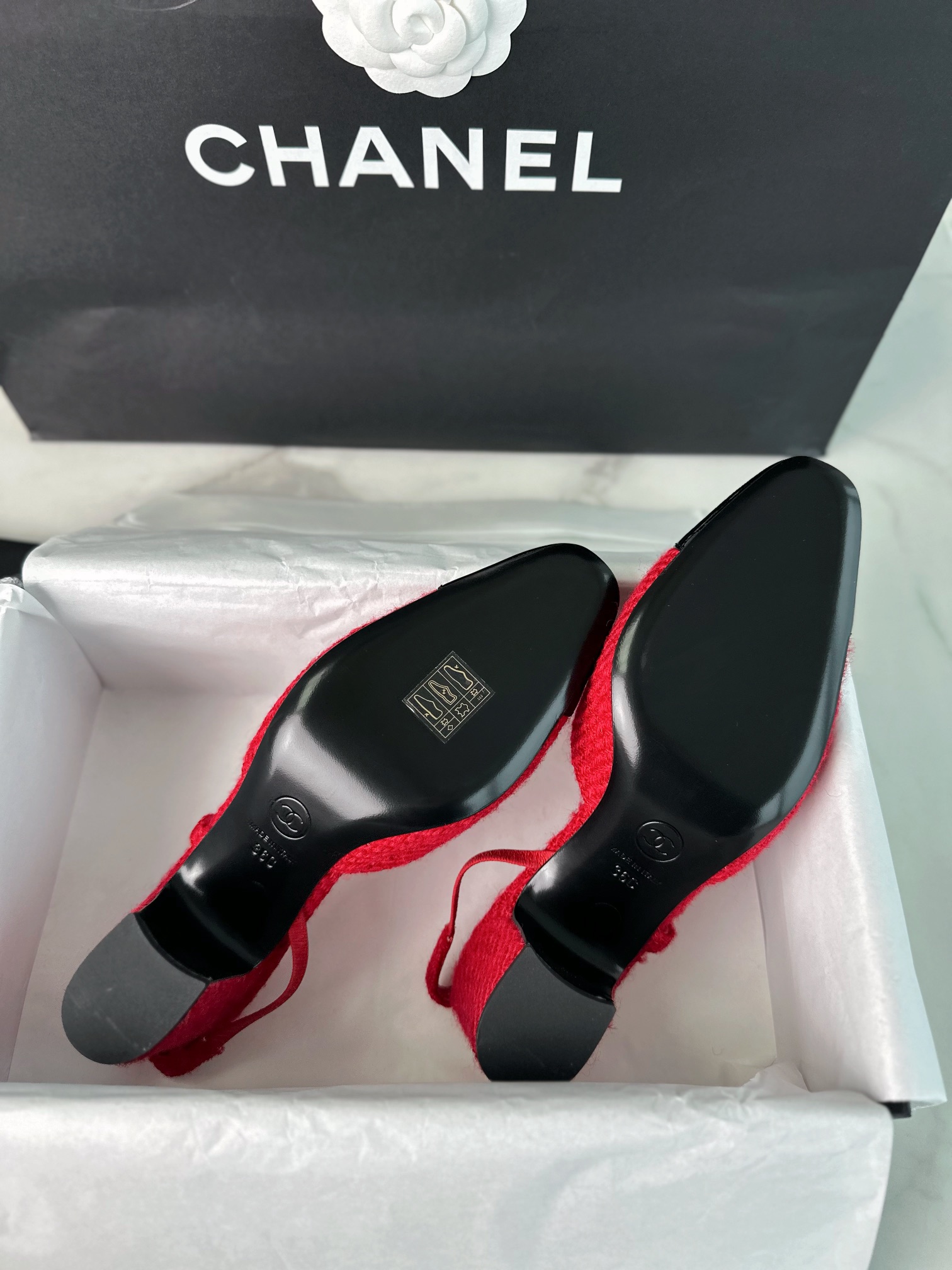 샤넬 레드 트위드 슬링백 하이힐